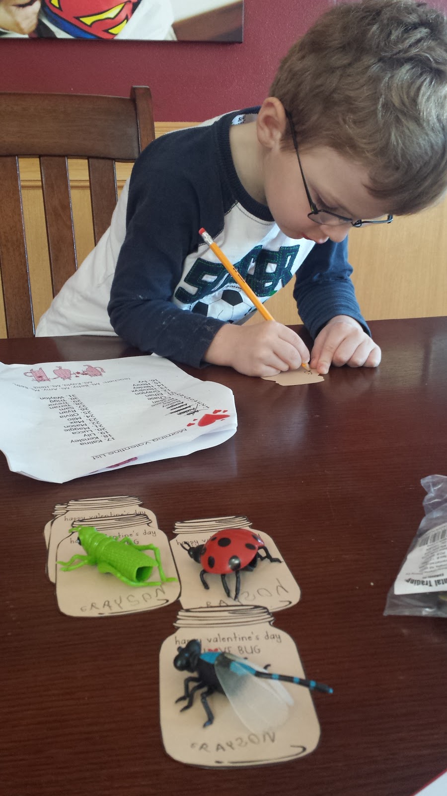 This year I bit off a little more than I should have. Planning 3 valentines parties, and we cannot have any food at all (boo!) So we opted to make some cute valentines. Grayson is doing bugs, Zach glowing "lightsabers" and kenna pencils. They all turned out super cute!